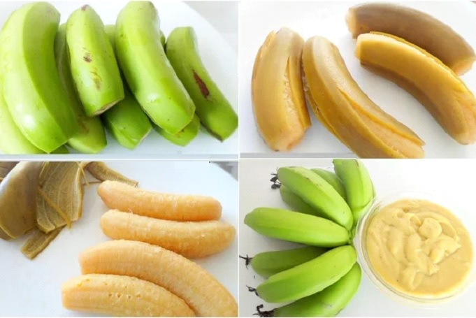 Para prepará-la você vai precisar adquirir algumas bananas verdes (de preferência aquelas colhidas na roça, sem o uso de agrotóxicos ou aceleradores de maturação) e cozinhá-las na panela de pressão, com a casca mesmo, por cerca de 20 minutos. Após o cozimento é só retirar as cascas e bater no liquidificador até formar uma pasta (você pode colocar um pouquinho de água para ajudar a bater).