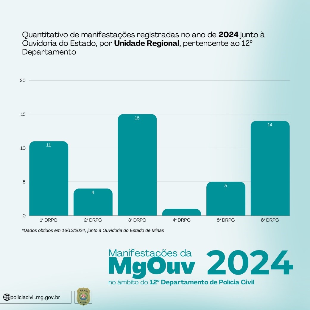 O 12º Departamento de Polícia em Ipatinga vem acompanhando todas as reclamações, conforme planilha referente aos anos de 2023 e 2024, demonstrando as respectivas resoluções ou justificativas apresentadas aos reclamantes e à sociedade. Considerando que, no mesmo período (até 16/12), foram registradas 62 manifestações em 2023 e 50 em 2024, constata-se, salvo melhor juízo, uma queda de 19,35% no número de reclamações na área do 12º DEPPC. Analisando por regionais, o mesmo período, Ipatinga apresentou uma queda de 45%; Itabira uma queda de 11.76%; João Monlevade 60%; Ponte Nova de 16,67%. Apenas as regionais de Caratinga e Manhuaçu apresentaram acréscimos.