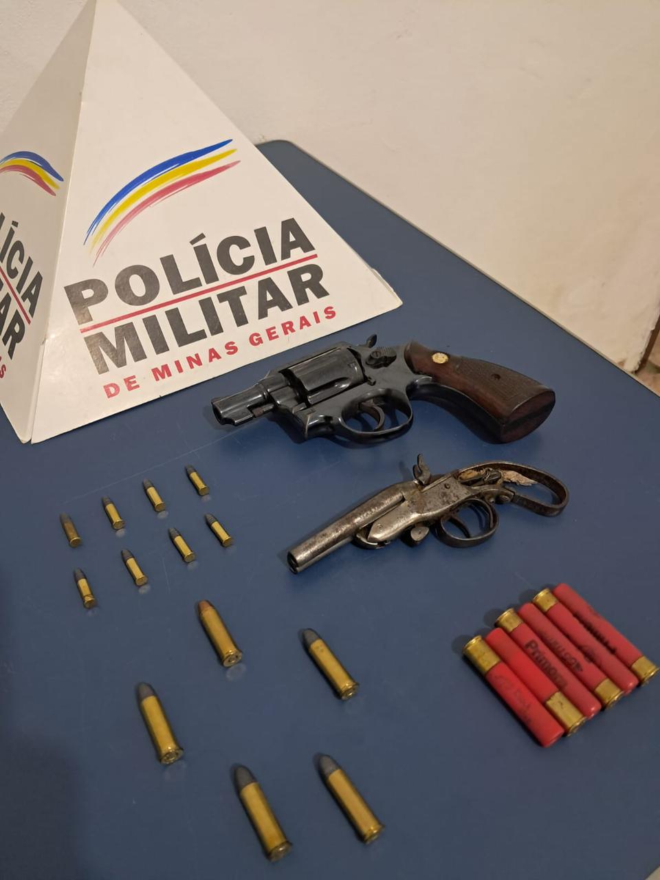 Com autorização do suspeito, as equipes policiais realizaram buscas no imóvel e encontraram, sob a cama, um bornal contendo um revólver calibre .38, uma garrucha calibre .22, além de 05 munições calibre 38, 06 munições calibre 36 e 08 munições calibre 22.