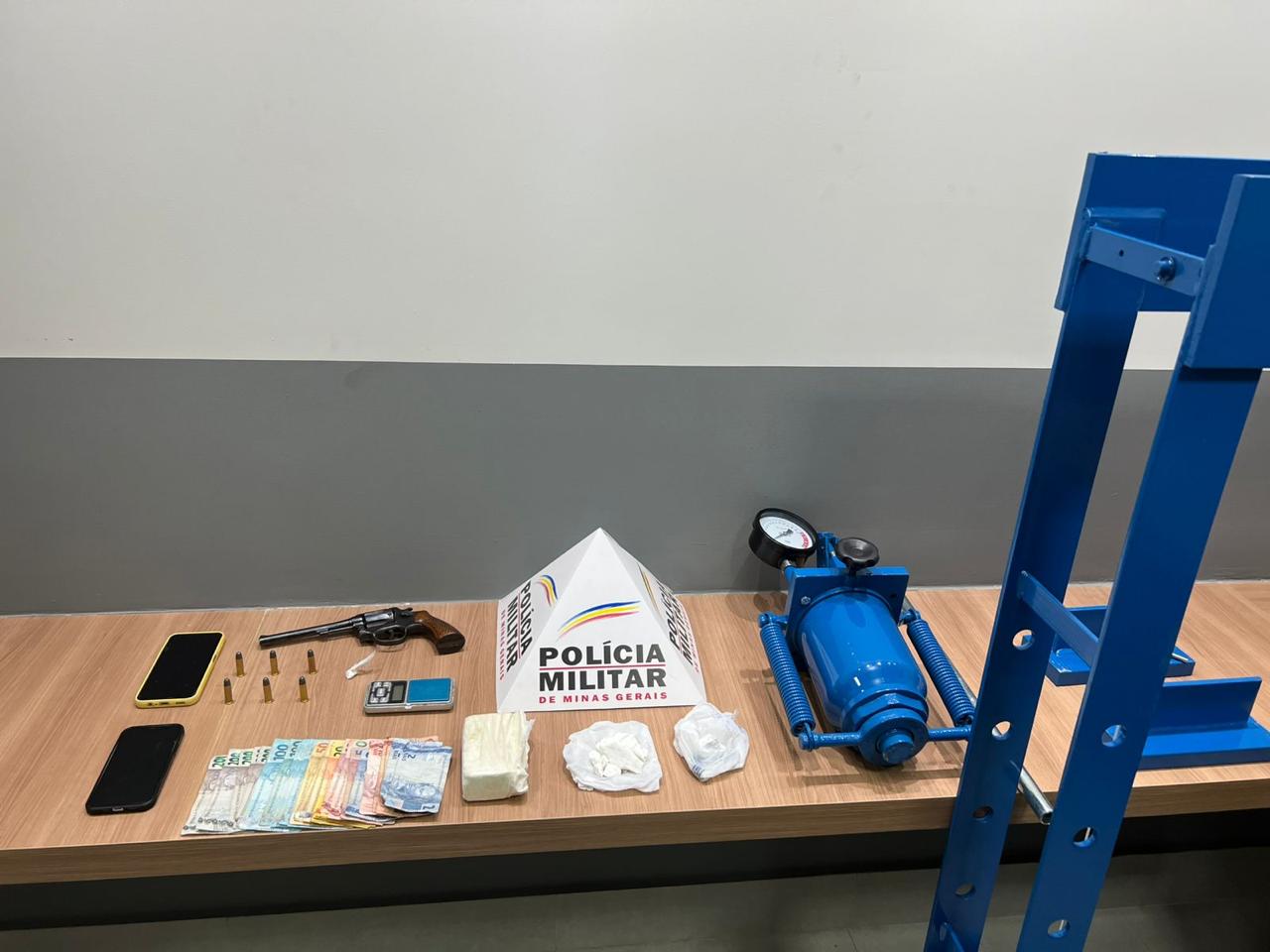 Durante a operação, os policiais apreenderam um revólver calibre .38 com seis munições, uma barra de cocaína, porções da mesma substância, uma prensa hidráulica, balança de precisão, dois celulares e a quantia de R$ 2.431 em dinheiro.