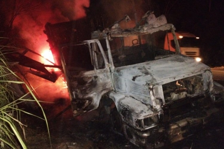 Caminhão é destruído por incêndio na BR-116 e ocupantes saem ilesos